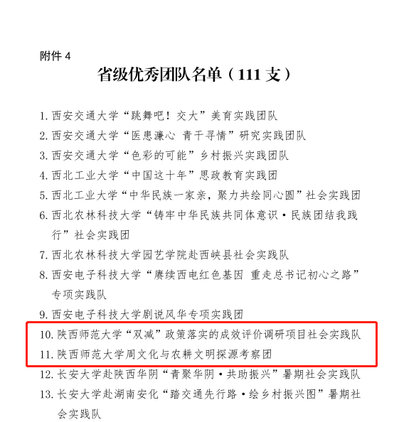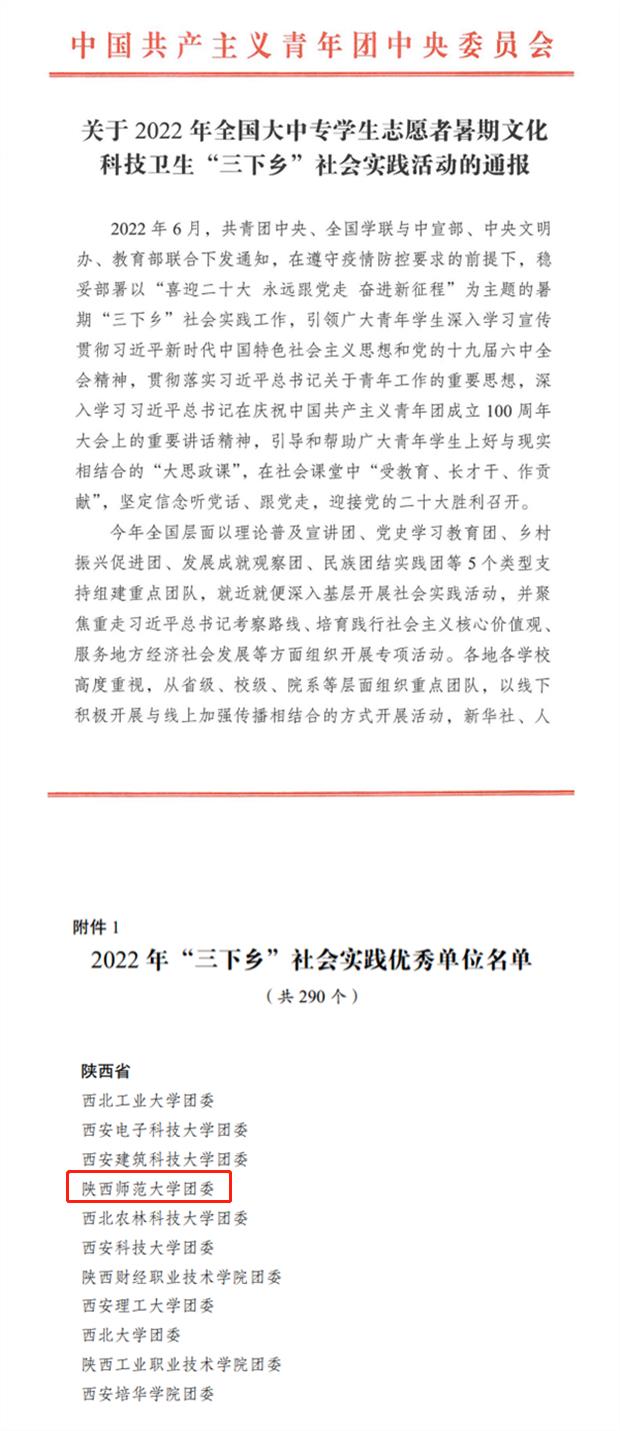 近日,共青团中央、全国学联与中宣部、中央文明办、教育部联合印发《关于2022年全国大中专学生志愿者暑期文化科技卫生“三下乡”社会实践活动的通报》,陕西师范大学大学团委荣获2022年全国“三下乡”社会实践优秀单位。
