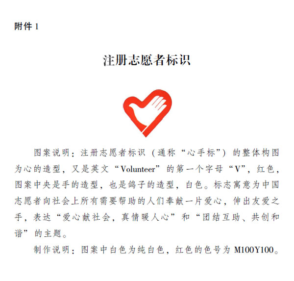 注册志愿者标识(通称“心手标”)的整体构图为心的造型,又是英文“Volunteer”的第一个字母“V”,红色,图案中央是手的造型,也是鸽子的造型,白色。标志寓意为中国志愿者向社会上所有需要帮助的人们奉献一片爱心,伸出友爱之手,表达“爱心献社会,真情暖人心”和“团结互助、共创和谐”的主题(图案见附件1)。