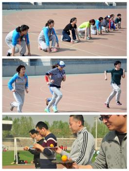 操场东北角,教师趣味运动会也在如火如荼的有序进行。“奔跑100米”“动力火车”“老鹰捉小鸡”“掷实心球”“巧运乒乓球”“抱球接力”,6个项目分男、女组进行比赛,老师们互相喝彩、加油助威,比赛过程趣味十足,活动现场充盈着快乐的笑声和轻松的氛围。