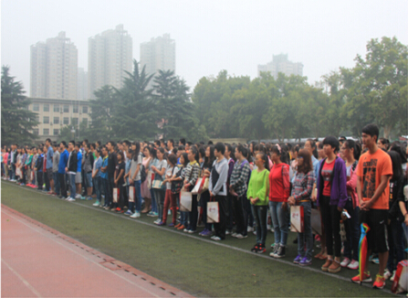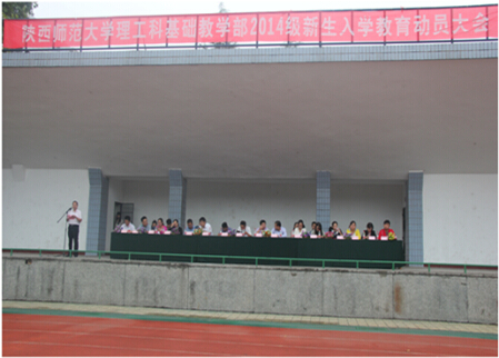 2014年9月12日上午8:00,理科部2014级新生入学教育动员大会在我校雁塔校区田径场举行。莅临此次大会的嘉宾有:我校校党委学工部部长、学生处处长刘建军,校团委书记鲁镇、教务处副处长石洛祥、党委学工部副部长、学生处副处长曲洪刚。理科部党总支书记、主任吴保卫,党总支副书记郑生忠、教学副主任周宝石、行政副主任郭元、办公室主任金卓明,团委书记鲁燕和全体教工。理科部2014级新生参加了此次大会。大会由郑生忠老师主持。