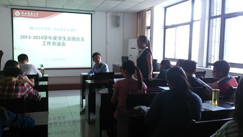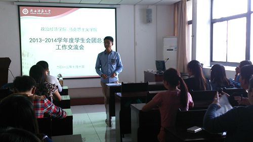 政治经济学院新一届学生会于9月2 6日正式成立了。为进一步推动学院团学工作创新发展,妥善安排下一阶段工作项目,10月10日下午1时,政治经济学院新一届团总支、学生会工作交流会在文澜楼学术报告厅顺利举行。学院团委书记李晔出席会议并发言。师范类团总支、非师范类团总支、公寓团总支及学生会全体学生骨干参加了会议。会议由新一届学生会主席朱佳明主持。