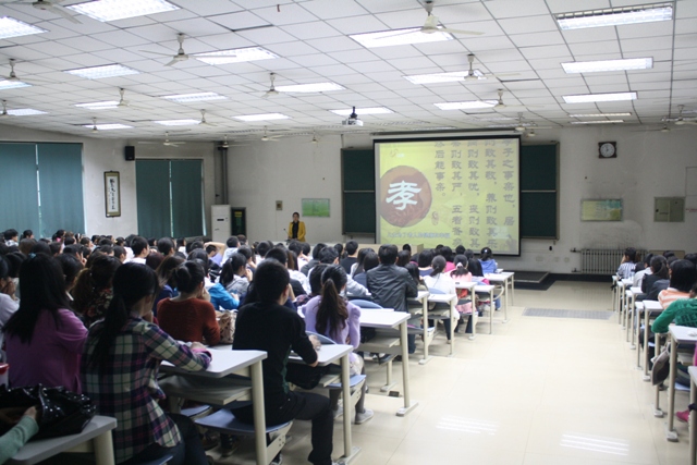 讨论过程中牟老师阐述了自己的观点,她首先从文字构造角度解释了“孝”与“教”的含义,她说:“孝”就是“老”和“子”,儿女侍奉父母,赡养父母就是孝;“教”及“孝”与“文”,学校教育学生的主要目的有两个,一是学习孝道、学会做人,二是学会知识,学到能力。接着牟老师引用孔子的“八德”、“五常”来进一步解读了孝的含义。最后,牟老师从同学们的日常表现,进一步谈到了孝道。她说:“作为学生的大家,现在还没有能力去自立、去赡养父母,但是大家可以做到遵守校纪,尊敬师长,这便是践行孝道;在学校严格要求自己,认真学习,照顾好自己,不让父母操心劳累,这便是具有孝心”。