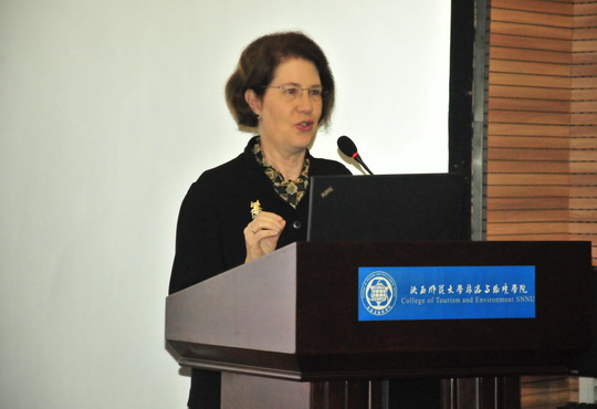3月8日下午2:30,美国北卡罗莱纳大学格林斯伯勒分校苏珊·威尔考特教授报做客经纬论坛,在长安校区格物楼六层数字旅游模拟实验室为广大师生做了Resurgent Eurasia : Corridor of Interconnections from the South China to the Caspain Sea(从南海到里海——复苏中的欧亚大陆廊道)的的报告。学院院长薛东前、副院长赵振斌,学院陈瑛、刘新颜、郝高建、郑海博及部分本科生、研究生等参加了报告会。报告会由赵振斌主持。