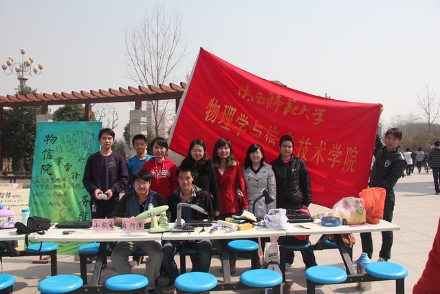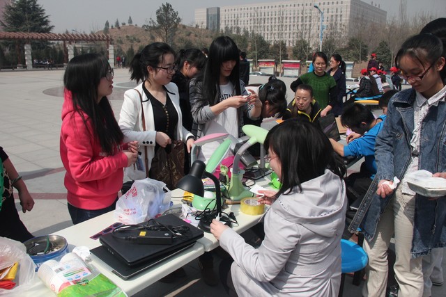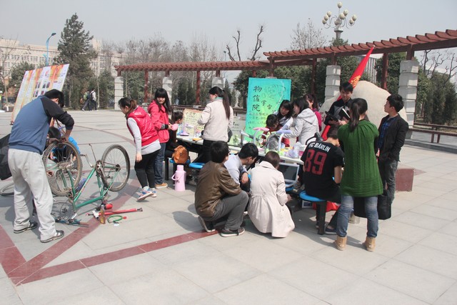 2013年 3月5日,物理学与信息技术学院在长安校区阳光苑广场举办了“学雷锋,义务维修”活动。在学院多位热心的小维修师的鼎力加盟下,此次活动取得圆满成功。活动中,值班人员热情接待,技术人员倾力维修,处处洋溢着温暖的雷锋精神。早上八点,一位年迈的教职工老人在看到正在井然布置活动现场的工作人员后,推来一辆待修的自行车。在技术人员埋头修理自行车时,老人谈及年轻时也像大家一般响应号召学雷锋做好事,在看到雷锋精神在新一代青年身上得以传承时老人表示十分欣慰。陆陆续续地,同学们在了解维修范围后,纷纷将自己的自行车、电脑、台灯、桌椅等物件带到活动现场信任地交给技术人员。送修最多的自行车使小维修师们变得蓬头垢面,汗流浃背。特别在饭点的时间段内,随着送修同学的增多,工作人员越发忙碌起来,很多工作人员顾不上吃饭一直坚守在维修岗位。在活动接近尾声时,仍有许多慕名而来的同学送来维修物件,工作人员表示,一定不辞辛苦努力加班为同学们维修,以不辜负大家的期望和信赖。