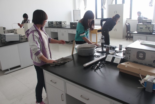 2013年3月4日,为改善实验室环境卫生,使同学们能在更加干净的环境中学习,让老师们能在更加整洁的氛围中工作,学生会组织部分学生在实验室进行了打扫卫生志愿服务活动。活动中,志愿者们根据老师的安排,分别到各个实验室进行清扫,具体任务包括了地面打扫、桌面清洁和仪器摆放等。同学们热情高涨,干劲十足,积极主动,分工协作,为实验室的环境清洁贡献出了自己的一份力量。在同学们良好的沟通和配合下,工作进程顺利而迅速。为了尽量减少工作中的纰漏,清洁完毕后,大家又细致地对实验室中精密仪器和危险仪器的放置方式一一进行了检查。经过两个小时的辛苦劳动,实验室焕然一新,整洁明亮。