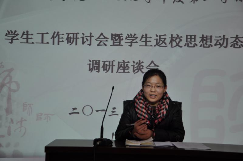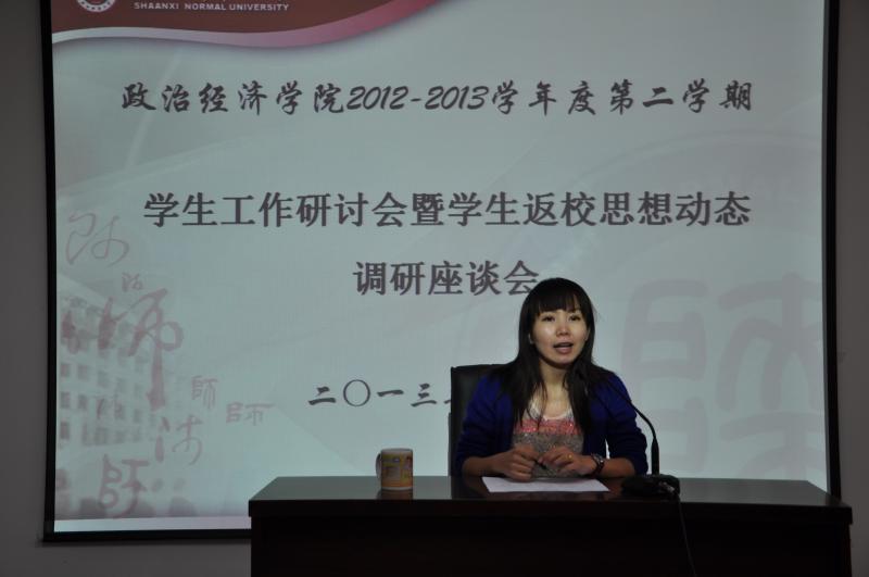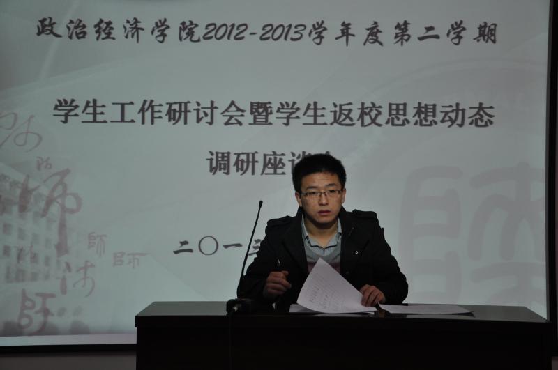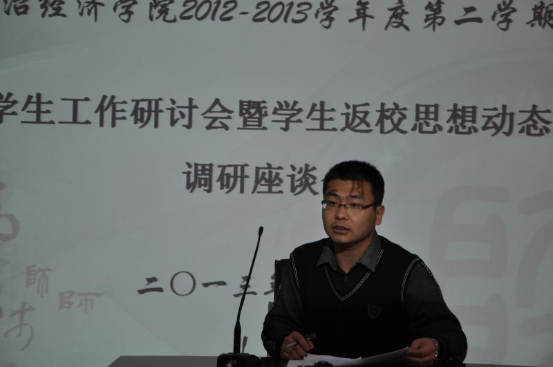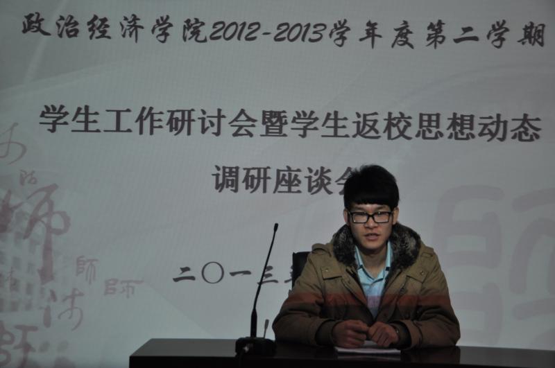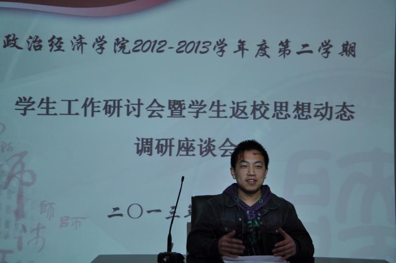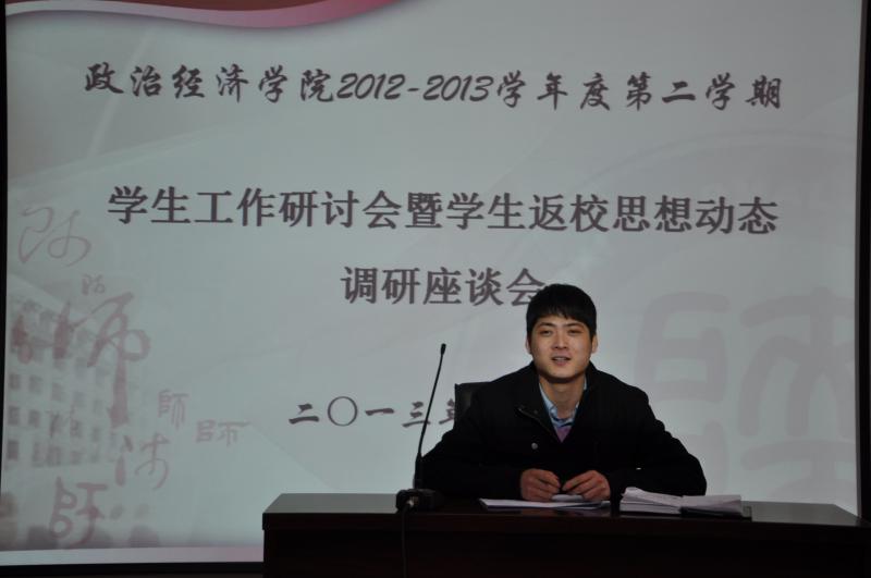 2013年3月1日上午9时,政经院2012—2013学年第二学期学生工作研讨会暨学生返校思想动态调研座谈会在学院二层报告厅召开。出席本次会议的有政经院党委副书记蒋毓新、团委书记李晔、2010级研究生辅导员王健、2010级本科生辅导员王颢以及研究生、本科生核心学生骨干。会议由团委书记李晔主持。 本次会议全面探讨了在学生党务、共青团、科研创新、学生就业、学生教育管理五个方面的工作思路,悉心听取两位辅导员和各学生骨干的意见与建议,同时充分了解掌握学生返校思想动态。 会上,2010级研究生辅导员王健指出,新学期学生工作应突出重点、贵在创新,要下力气、花功夫、费心思,组织举办好大学生就业技能大赛。同时,他强调要对研究生综合表现进行量化考察、定性分析,使考察分析更公平、公正、科学;2010级本科生辅导员王颢则希望学生骨干秉承 “务实、创新、传承、合作、发展”的精神,新学期再接再厉为政经院、为广大同学们办实事、解难事、做好事;研究生会主席刘峰存对即将开办的各项活动满怀激情与信心,他表示新学期研究生会将不断开拓创新,提升活动品质,打造活动特色,以确保各项活动的吸引力和影响力;学生会主席李宛冰也在会上慷慨陈词,他强调了学生会本学期的工作重点:一是完善学生会内部组织管理机制;二要做好常规工作,突出重点;三要团结协作,积极向研究生会学习;四是创办富有生命力、传承性的品牌活动。 最后,党委副书记蒋毓新从对学生工作的定位、布局和怎样做好学生工作三个方面对本次研讨会进行了全面细致的总结。她强调,学生工作要坚持五个必须:“必须以服务学院发展为中心,必须以学生为重心,必须坚持学院特色,必须要虚中务实;必须不断探索、思考”。她希望新学期学生骨干保持良好的精神状态,齐心协力,认真完成每一项学生工作,并注重自身能力的提升,进一步扩大学生干部的影响力。 本次营造了敬业、创新、和谐的工作氛围,为新学期各项工作有条不紊的开展奠定了良好的基础,研究生会、学生会也必将跨上一个崭新的台阶。
