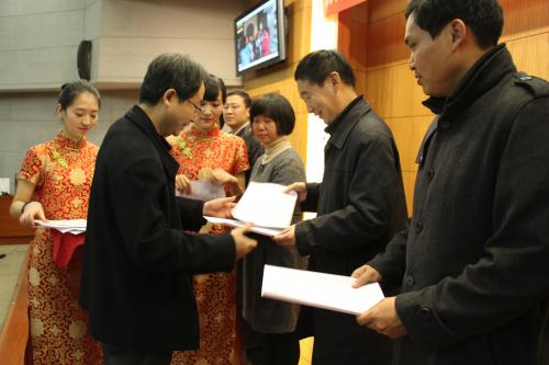 中午11点,仪式接近尾声,各高校领导与陕西历史博物馆方面签署交换协议书,各高校志愿者队队长在会后领取2014年志愿者服务手册。最后,参与本次活动的所有人员合影留念。