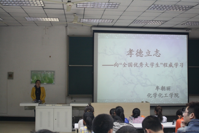 为了发扬孝道,践行孝心,弘扬中华民族传统美德,促进当代大学生道德品质的提升,4月14日,化学化工学院在文渊楼开展了“孝德立行——向‘全国优秀大学生’程威学习”活动。2010级辅导员牟朝丽老师主持了活动。 ...