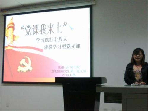 4月25日晚,旅游与环境学院2012级研究生第一党支部在格物楼一层报告厅召开了“党课我来上”主题系列活动之 “学习践行十八大 建设学习型党支部”交流会。支部党员与积极分子踊跃参加。 党支部宣传委员冯婷婷主持。 &...